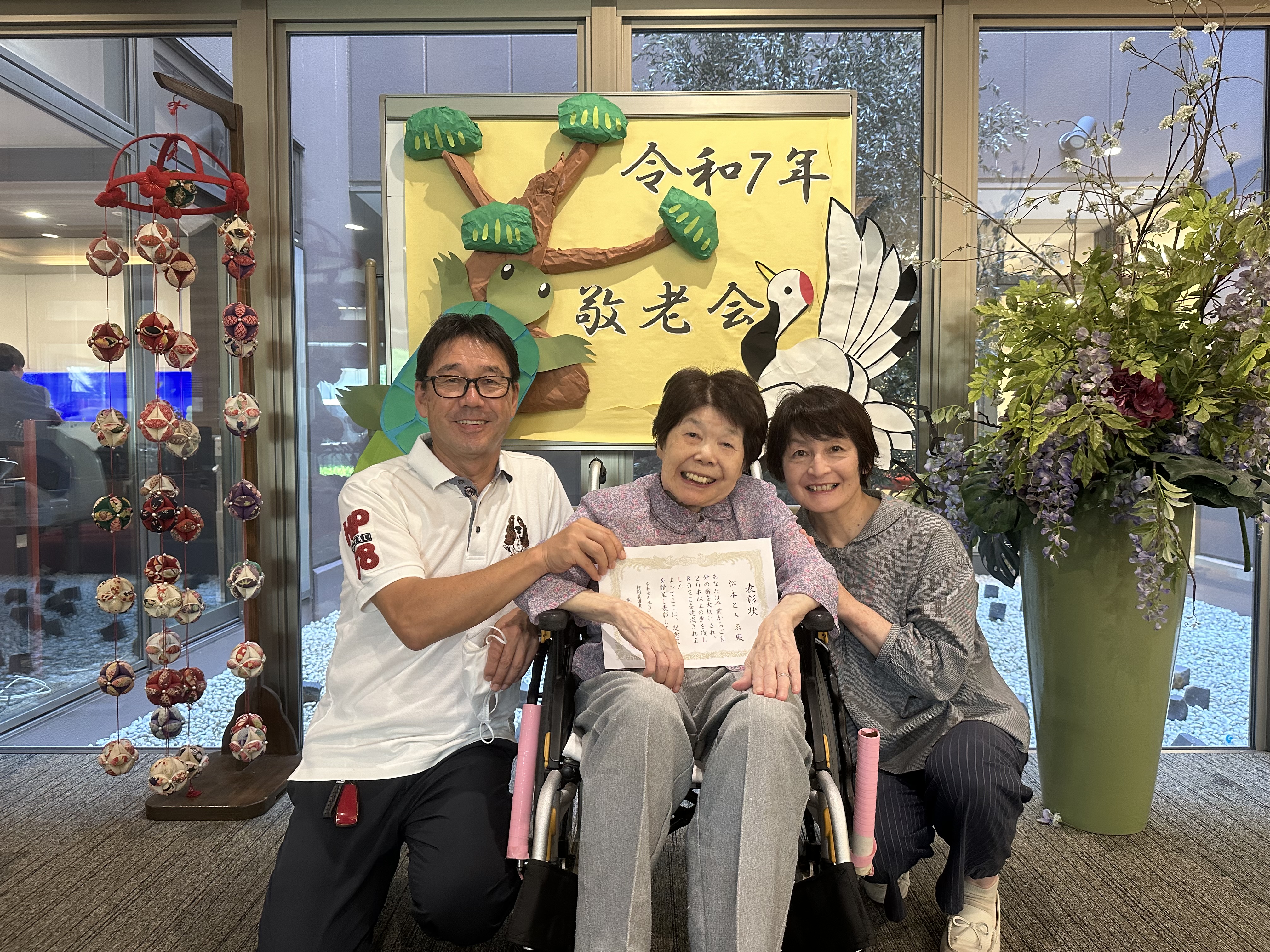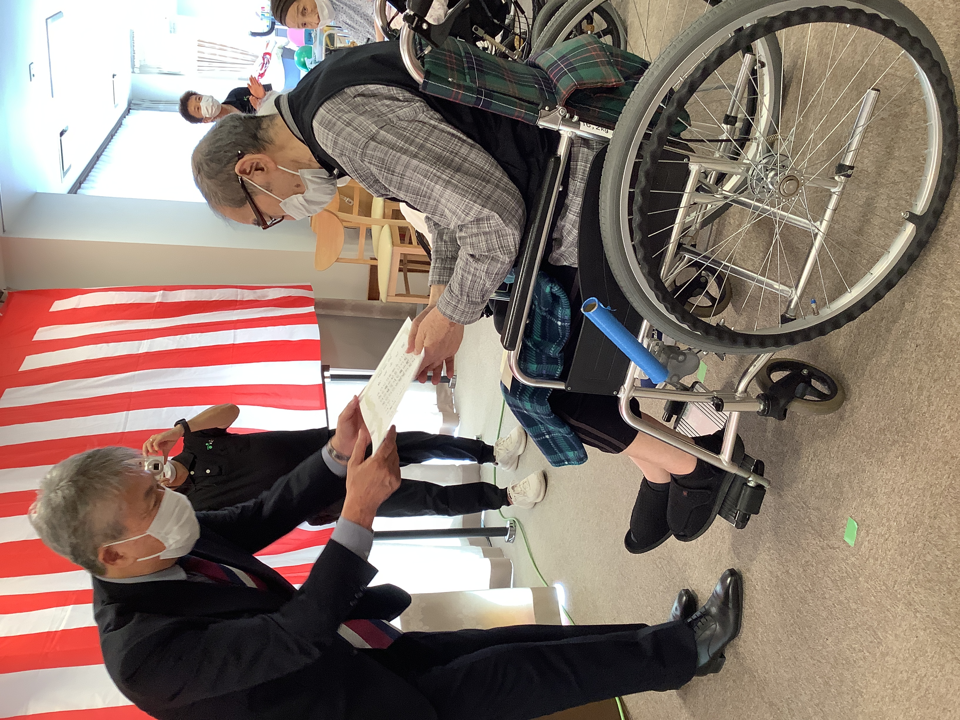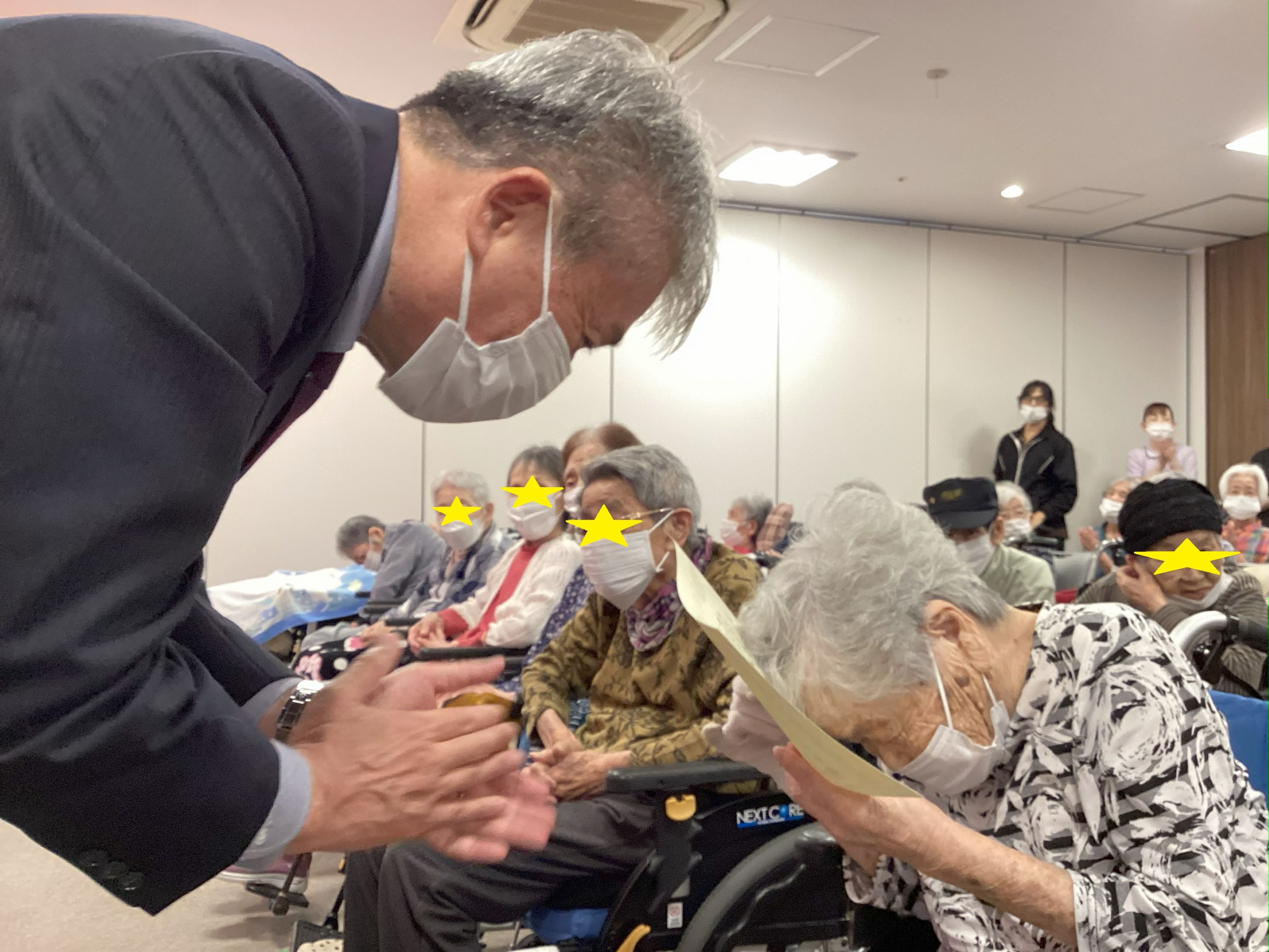 施設長からのお祝いの言葉に続き、節目の方々や100歳以上の方々の賀寿表彰と8020運動(80歳を過ぎてご自分の歯が20本以上残っている方)の表彰を行いました。