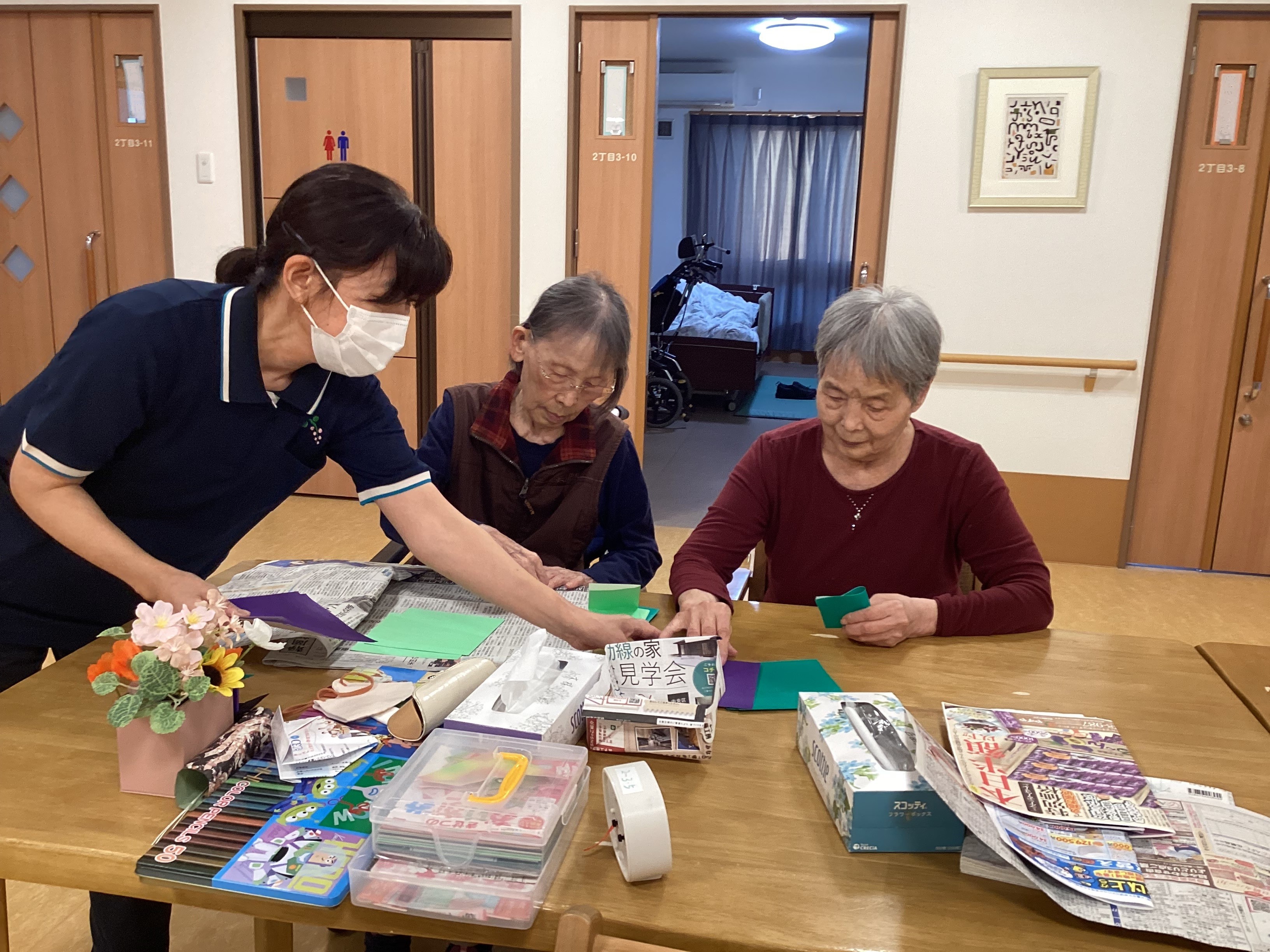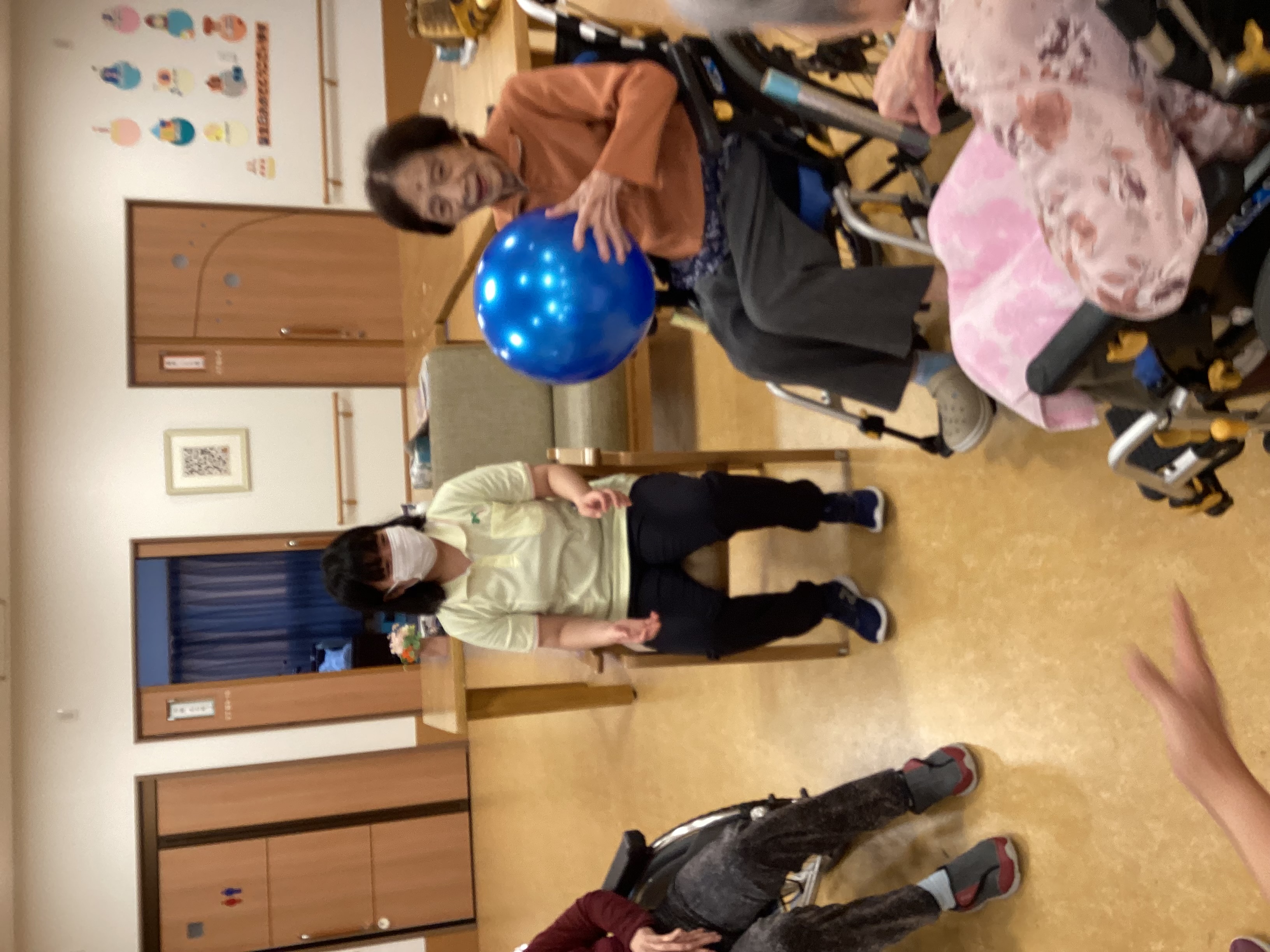 さて、私たちのユニットでは、入居者様とボール投げや折り紙などで作品を作り、