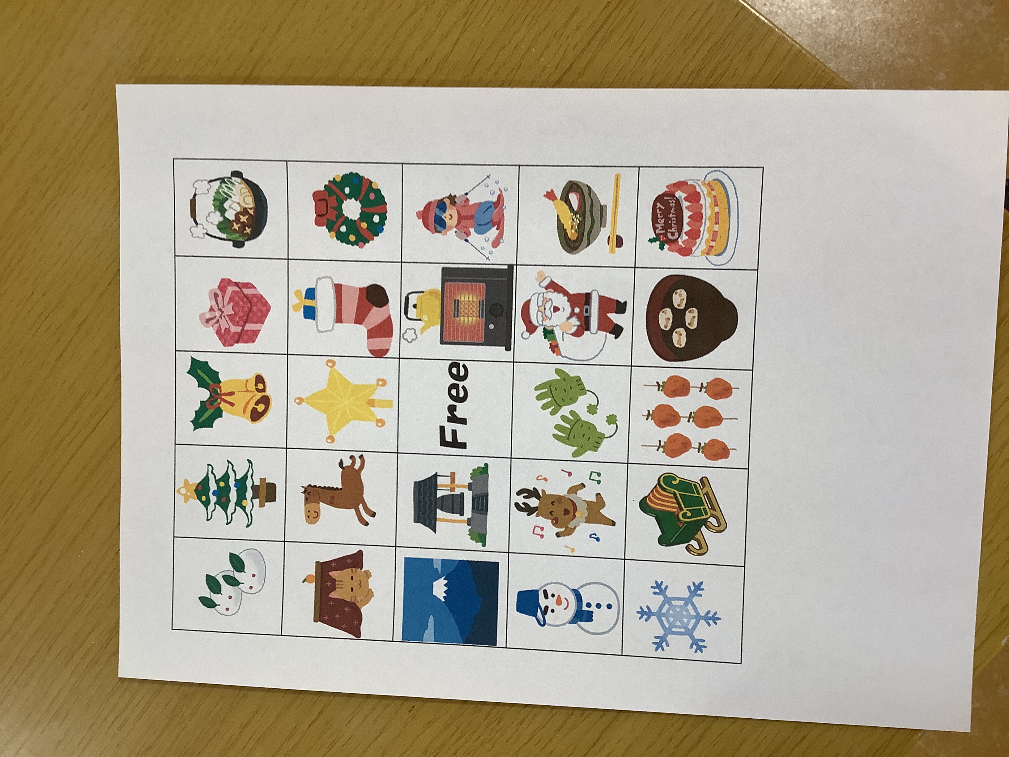 皆様に配られたのはクリスマスから年末らしいイラストの並んだ賑やかなビンゴカードです。